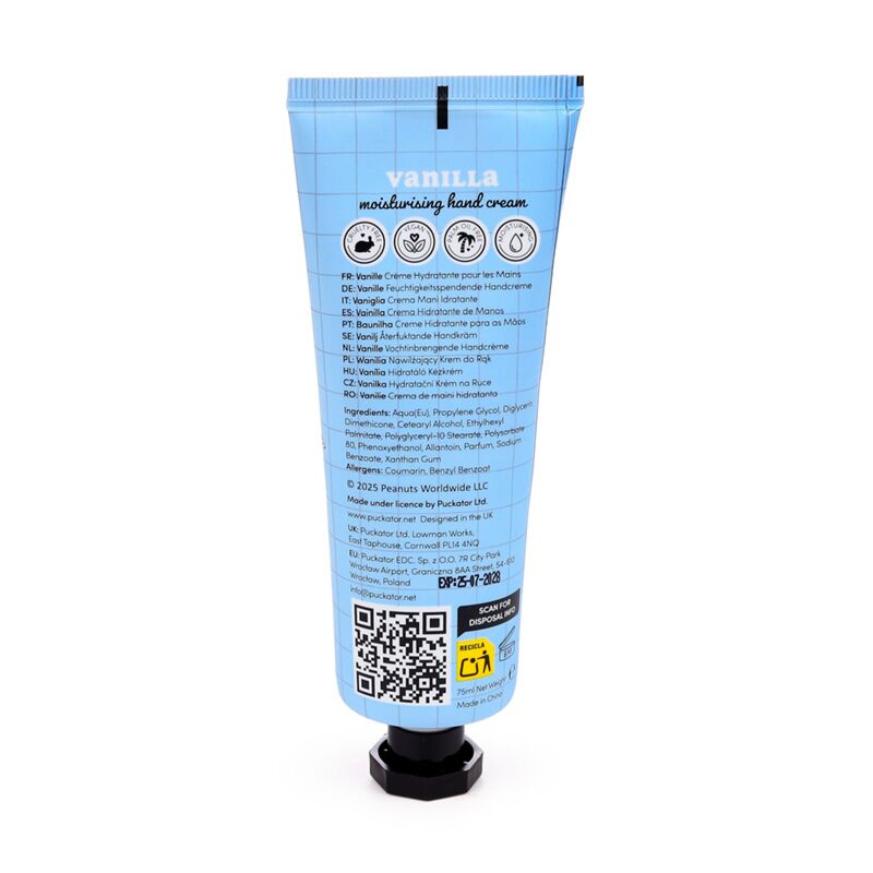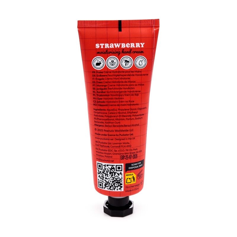 https://www.puckator.de/handc21-peanuts-snoopy-woodstock-handcreme-75ml-erdbeere-vanille.htmlHANDC21Peanuts Snoopy & Woodstock Handcreme 75ml - Erdbeere & Vanille<p>Peanuts Snoopy & Woodstock Handcreme 75ml - Erdbeere & Vanille</p><ul><li><strong>Material:</strong> Polyethylen und Aluminium (Tube), Polypropylen (Deckel) und Handcreme</li><li><strong>Duftstoffe:</strong> Erdbeere und Vanille</li><li><strong>Inhaltsstoffe:</strong>Alle Inhaltsstoffe sind auf der Verpackung ausgewiesen.</li><li><strong>Vegan:</strong>Ja</li><li><strong>Palmölfrei:</strong>Ja</li><li><strong>Keine Tierversuche:</strong>Ja</li><li><strong>Lizenz-Informationen:</strong> Dieses Produkt ist für die unten aufgeführten Länder vollständig lizenziert. Wenn Sie sich außerhalb dieser Gebiete befinden, versuchen Sie bitte nicht, dieses Produkt zu kaufen. Andernfalls wird es aus Ihrer Bestellung entfernt. Für weitere Informationen wenden Sie sich bitte an unseren Kundenservice.<br><strong>Lizenzierte Gebiete: </strong><i>Åland-Inseln, Albanien, Armenien, Österreich, Aserbaidschan, Azoren (Portugal), Balearen (Spanien), Belgien, Bermuda, Bosnien und Herzegowina, Bulgarien, Kanarische Inseln (Spanien), Ceuta und Melilla, Korsika (Frankreich), Kroatien, Zypern, Tschechische Republik, Dänemark, Estland, Finnland (Festland), Frankreich (Festland), Französisch-Guayana, Georgien, Deutschland, Gibraltar, Griechenland, Guadeloupe, Guernsey (Kanalinseln), Heiliger Stuhl (Vatikanstadt), Ungarn, Island, Isle of Man (Vereinigtes Königreich), Italien (Festland), Jersey (Kanalinseln), Kasachstan, Kirgisistan, Lettland, Liechtenstein, Litauen, Luxemburg, Nordmazedonien, Madeira (Portugal), Malta, Martinique, Mayotte, Moldawien, Monaco, Montenegro, Niederlande, Norwegen, Polen, Portugal (Festland), Réunion, Rumänien, Saint-Martin (französischer Teil), San Marino, Serbien, Sizilien (Italien), Slowakei, Slowenien, Spanien (Festland), Schweden, Schweiz, Tadschikistan, Türkei, Ukraine, Vereinigtes Königreich (Festland), Vereinigtes Königreich (Nordirland, Highlands und Inseln), Usbekistan</i></li><li><strong>CPNP:</strong> TBC</li></ul><p><strong>Produkttressourcen:</strong></p><ul><li><strong>Möchten Sie mehr über den Einkauf bei Puckator erfahren?</strong> Dann lesen Sie unseren<a href="/advice-centre" target="_blank" title="Puckator DE Leitfaden für Kundeninformationen"> Leitfaden für Kundeninformationen.</a></li></ul><p><img src="{{media url="wysiwyg/Symbols/CRUELTYFREE.jpg";}}" alt="Cruelty Free Packaging Symbol|Puckator" width="100" height="100"><img src="{{media url="wysiwyg/Symbols/PALMOILFREE.jpg";}}" alt="Palm Oil Free Packaging Symbol|Puckator" width="100" height="100"><img src="{{media url="wysiwyg/Symbols/VEGAN.jpg";}}" alt="Vegan Packaging Symbol|Puckator" width="100" height="100"></p>https://www.puckator.de/media/catalog/product/H/A/HANDC21_001_1763136922.jpg2.15instock2.152.1500Puckator000https://www.puckator.de/media/catalog/product/H/A/HANDC21_001_1763136922.jpg/Lippenbalsame/Lizenzierte Aromatherapie/Peanuts - Snoopy/Handcremes/Wieder auf Lager/Meistverkaufte Produkte2025-06-11T15:36:55+0000