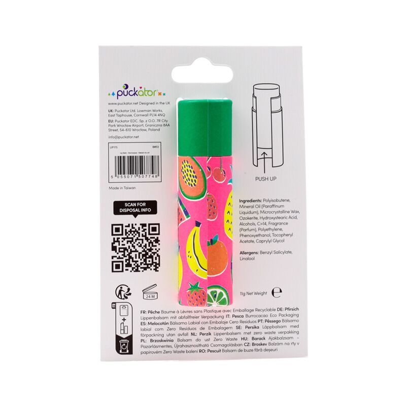 https://www.puckator.de/lip175-summer-fruits-sommer-obst-lippenpflegestift-im-papierhalter.htmlLIP175Summer Fruits Sommer Obst Lippenpflegestift im Papierhalter<p>Summer Fruits Sommer Obst Lippenpflegestift im Papierhalter</p><ul><li><strong>Material:</strong> Lippenbalsam, Papier und Pappe</li><li><strong>Geschmack:</strong> Pfirsich</li><li><strong>Palmölfrei:</strong> Ja</li><li><strong>Glutenfrei: </strong>Ja</li><li><strong>Vegan: </strong>Ja</li><li><strong>Inhaltsstoffe:</strong> Vollständige Inhaltsstoffe und Mindesthaltbarkeitsdatum sind auf dem Artikel angegeben.</li><li><strong>Sicherheitshinweis:</strong> Dies ist kein Spielzeug oder Lebensmittel.</li><li><strong>CPNP:</strong> TBC</li></ul><p><strong>Produkttressourcen:</strong></p><ul><li><strong>Möchten Sie mehr über den Einkauf bei Puckator erfahren?</strong> Dann lesen Sie unseren<a href="/advice-centre" target="_blank" title="Puckator DE Leitfaden für Kundeninformationen"> Leitfaden für Kundeninformationen.</a></li></ul><p><img src="{{media url="wysiwyg/Symbols/PLASTICFREE.jpg";}}" alt="Plastic Free Packaging Symbol|Puckator" width="100" height="100"><img src="{{media url="wysiwyg/Symbols/CRUELTYFREE.jpg";}}" alt="Cruelty Free Packaging Symbol|Puckator" width="100" height="100"><img src="{{media url="wysiwyg/Symbols/PALMOILFREE.jpg";}}" alt="Palm Oil Free Packaging Symbol|Puckator" width="100" height="100"><img src="{{media url="wysiwyg/Symbols/VEGAN.jpg";}}" alt="Vegan Packaging Symbol|Puckator" width="100" height="100"></p>https://www.puckator.de/media/catalog/product/L/I/LIP175_001_1747149020.jpg0.59instock2.340.59751.75Puckator000https://www.puckator.de/media/catalog/product/L/I/LIP175_001_1747149020.jpg188781887619389/Lippenbalsame/Foodiemals/Summer Fruits - Sommer Obst /Ausverkauf2024-11-01T14:16:50+0000