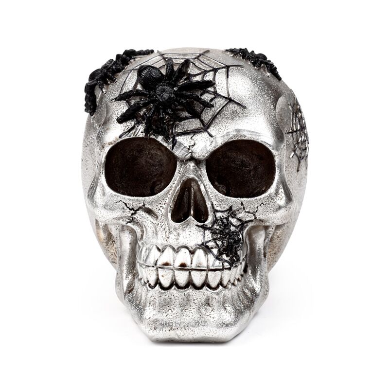Silberner Totenkopf mit schwarzen Spinnen und Netzen