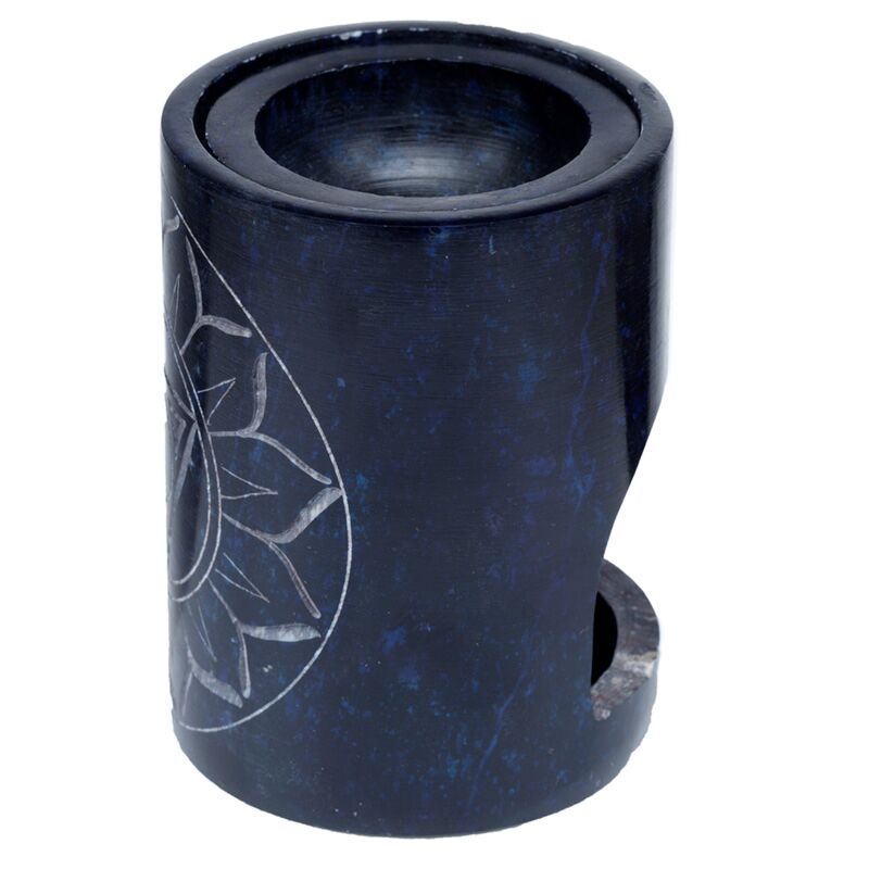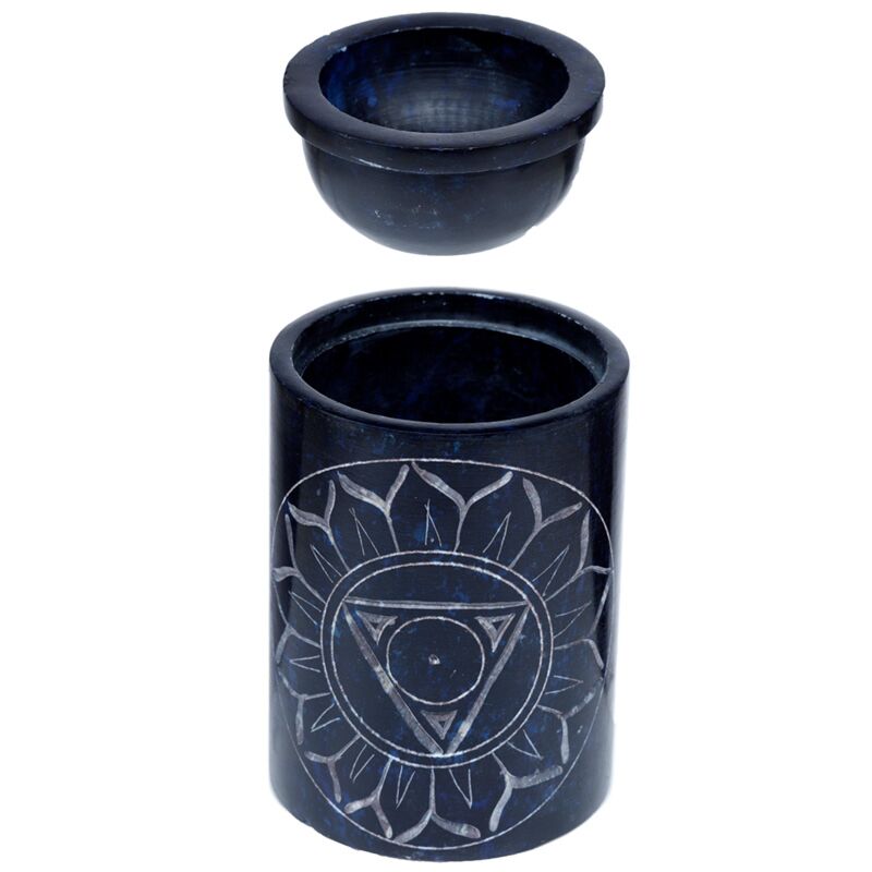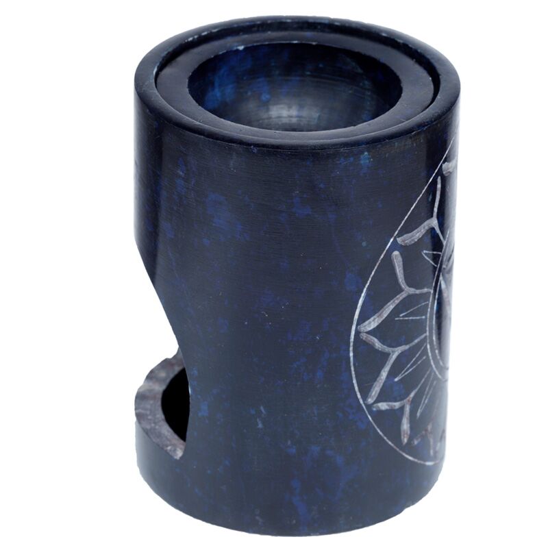 Dunkelblaue Speckstein Duftlampe mit geschnitztem Chakra-Symbol